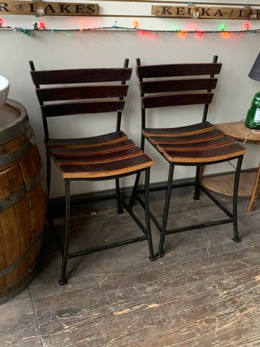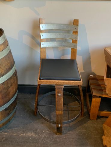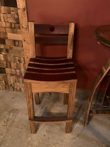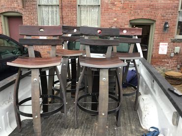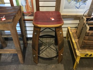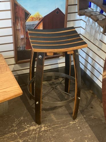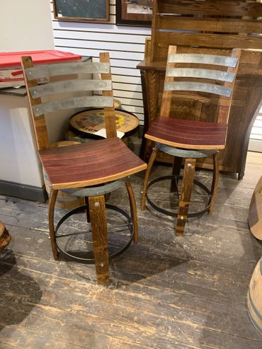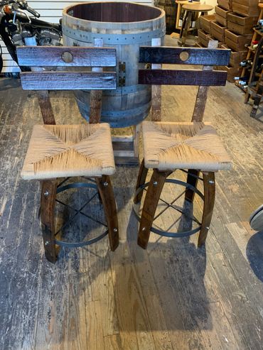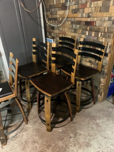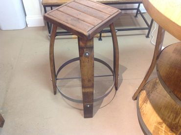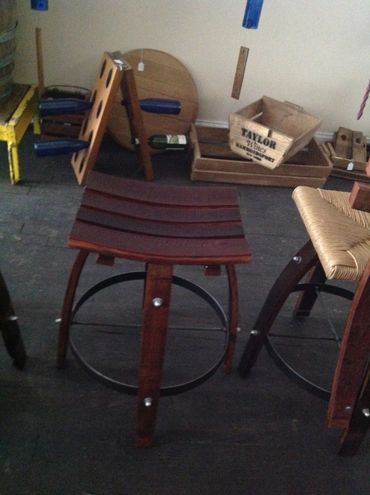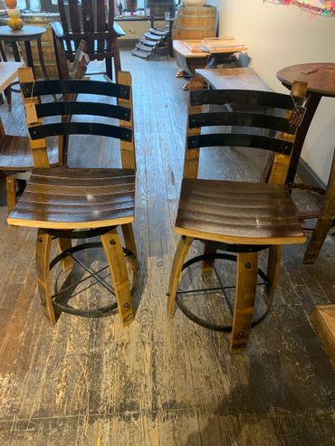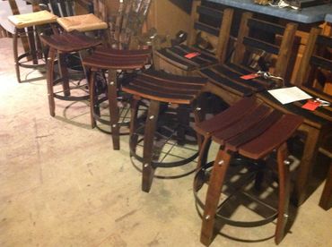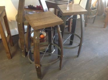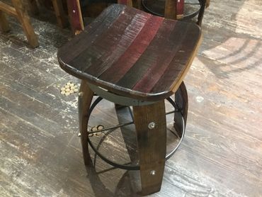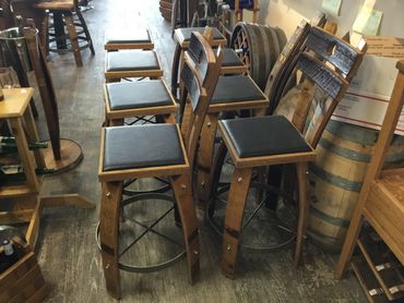 All stools seen in this section can be built to suit your needs. They can be any height, they can be stained a variety of colors, and they can be made with wine barrels or bourbon barrels. Metal work can be black or galvanized. There are also different options for the seat and the stool backs.